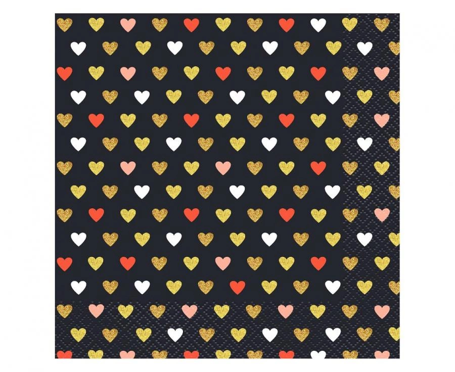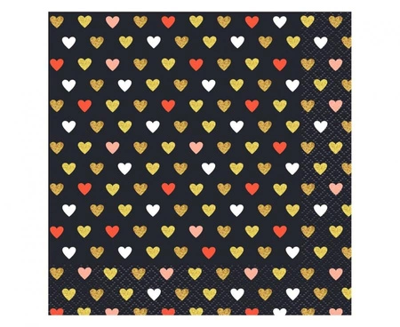 Serwetki Kolekcja XOXO (czarne) to zestaw 20 papierowych serwetek 33×33 cm z nadrukiem kolorowych serduszek. Przeznaczone do dekoracji stołu na Walentynki, urodziny, wieczór panieński, baby shower oraz kameralne przyjęcia. Łatwe do skompletowania z innymi elementami kolekcji.