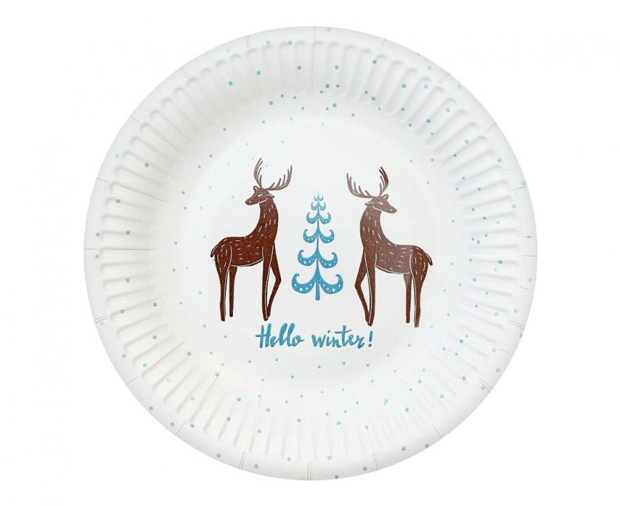 Talerzyki papierowe Hello Winter o średnicy 18 cm, 6 sztuk w opakowaniu. Wykonane z papieru z certyfikatem FSC, w białej kolorystyce z akcentami złotego i niebieskiego, z nadrukiem „Hello Winter” oraz motywami reniferów i choinki. Najbardziej przydatne na zimowe przyjęcia, świąteczne stoły i tematyczne uroczystości.
