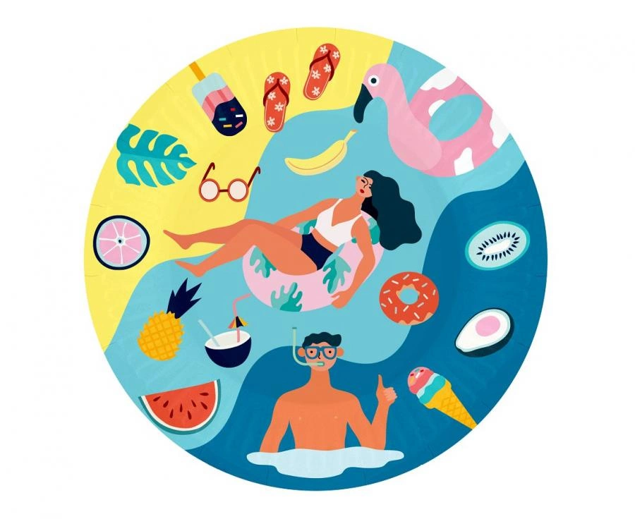 Talerzyki papierowe z kolekcji Summer - Let's Party (beach), średnica 18 cm, 6 sztuk w opakowaniu. Dekoracyjny nadruk z motywami plażowymi i owocowymi. Najlepiej sprawdzą się na letnich przyjęciach — garden party, pool party, urodziny, wieczór panieński czy baby shower — do serwowania przekąsek i deserów. Materiał: papier, okrągłe, lekkie — ułatwiają szybkie przygotowanie zastawy i sprzątanie po wydarzeniu.
