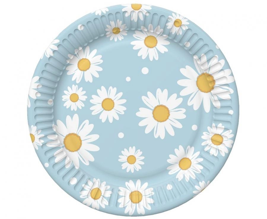 Talerzyki papierowe, niebieskie, stokrotki, 18 cm, 6 szt.