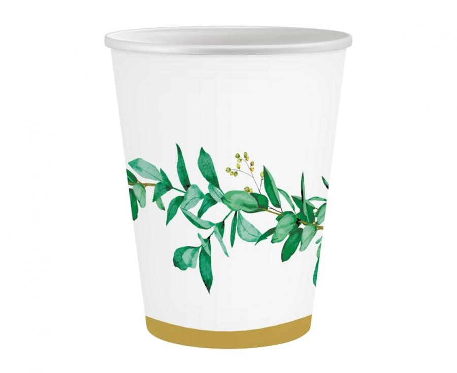 Kubeczki papierowe Celebrate z motywem listków, 250 ml, 6 sztuk w opakowaniu. Wykonane z papieru z powłoką PE, która zapobiega przeciekaniu i rozmiękczaniu przy kontakcie z napojami. Przeznaczone na wesela, baby shower, urodziny i inne przyjęcia wymagające estetycznych jednorazowych naczyń.