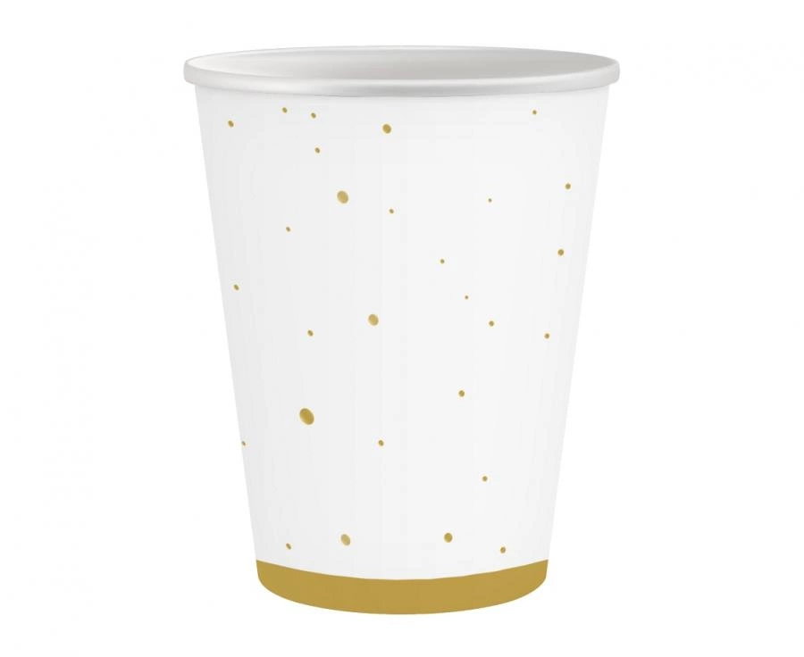 Papierowe kubeczki Celebrate (złote), 250 ml, 6 szt. to zestaw jednorazowych kubków z grubego papieru i powłoką PE, odpornych na przeciekanie. Nadają się do serwowania ciepłych i zimnych napojów podczas wesel, urodzin, baby shower, wieczorów panieńskich i świąt.
