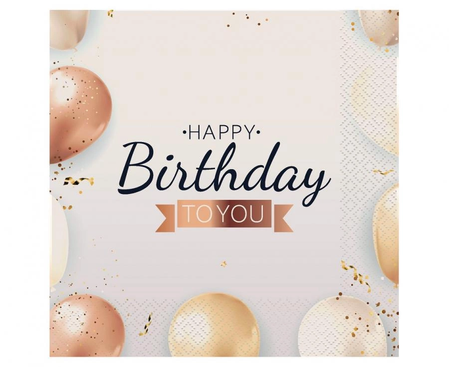 Papierowe serwetki "Happy Birthday" 33 x 33 cm, 20 sztuk, z złotym nadrukiem "Happy birthday" i motywem balonów. Produkt przeznaczony głównie na urodziny; można je także wykorzystać podczas wieczoru panieńskiego, baby shower lub jako praktyczny element stołu na przyjęciach tematycznych.