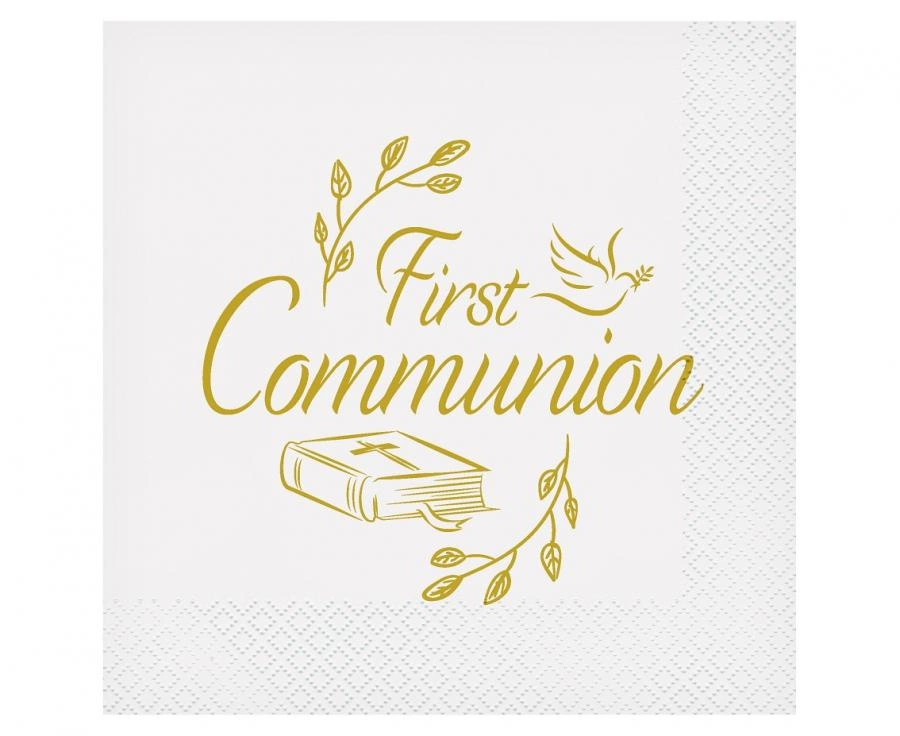 Serwetki papierowe „First Communion” 33×33 cm, 20 sztuk. Białe z złotym napisem „First Communion”, zaprojektowane na uroczystość Pierwszej Komunii i inne rodzinne przyjęcia przy stole. Wykonane z trójwarstwowego papieru, posiadają certyfikat FSC — praktyczne w rozłożeniu i jednorazowym użyciu.