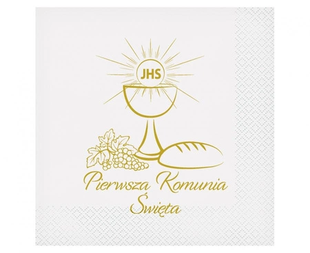 33 x 33 cm • 20 szt. w opakowaniu • Napis: Pierwsza Komunia Święta • Motyw kielicha • Certyfikat FSC