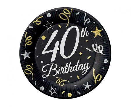 Czarne papierowe talerzyki o średnicy 18 cm z nadrukiem "40th Birthday". Opakowanie zawiera 6 sztuk. Produkt przeznaczony na przyjęcia z okazji 40. urodzin — sprawdzi się jako talerzyki deserowe, do serwowania małych przekąsek oraz jako element stołowej aranżacji lub tła do zdjęć.