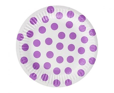 Talerzyki papierowe GoDan, średnica 18 cm, opakowanie 6 sztuk. Lawendowy kolor z nadrukiem groszków; okrągły kształt wykonany z papieru. Przeznaczone do serwowania przekąsek, ciast i słodkości podczas przyjęć takich jak urodziny, baby shower, wieczór panieński czy świąteczne spotkania.