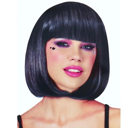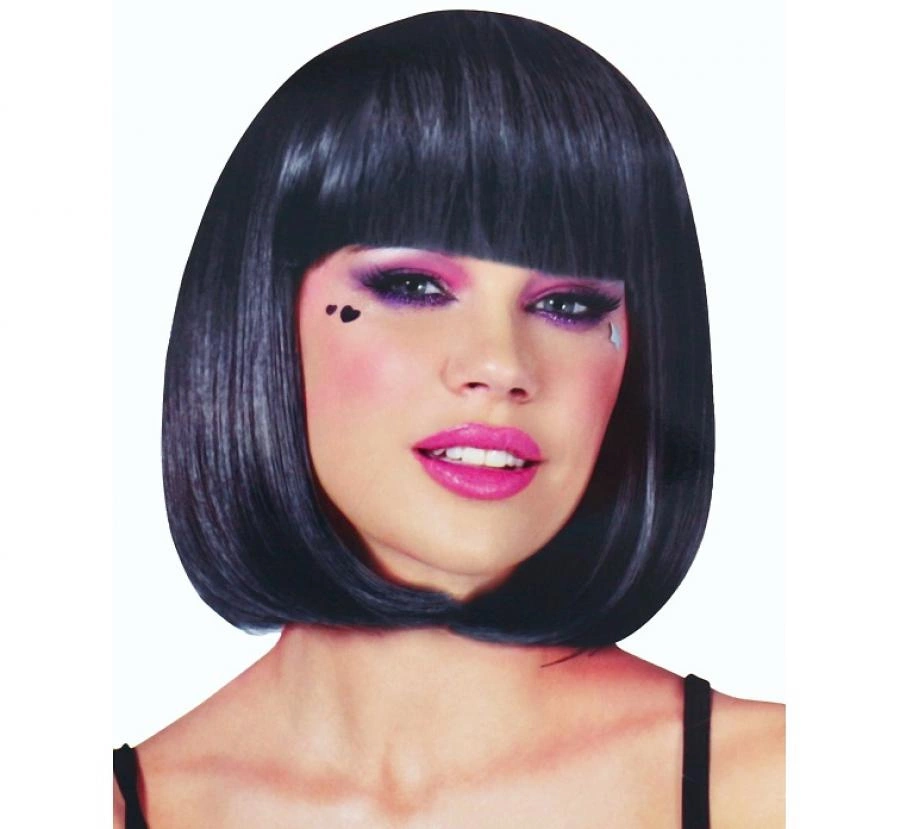 Peruka Bob w kolorze czarnym — syntetyczny model w rozmiarze uniwersalnym z prostą grzywką i włosami podwiniętymi pod brodę. Przeznaczona na imprezy tematyczne, wieczory panieńskie, Halloween, bale kostiumowe i sesje zdjęciowe; łatwo dopasowuje się dzięki elastycznej siatce.