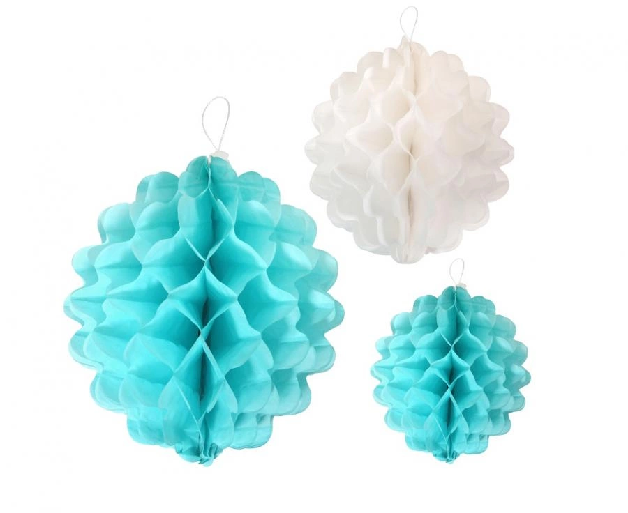 Papierowe rozety dekoracyjne – zestaw 3 kul o średnicach 15 cm, 22 cm i 29 cm w miksie odcieni niebieskiego. Przeznaczone do zawieszania wewnątrz podczas przyjęć: wesele, wieczór panieński, urodziny czy baby shower. Lekkie, łatwe w montażu, tworzą wielowarstwowe kompozycje kolorystyczne.