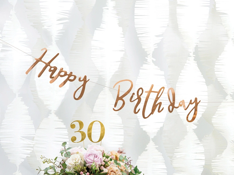 - Baner przeszywany Happy Birthday, wykonany z papieru lustrzanego w kolorze różowego złota, wymiary: wysokość ok 16,5 cm, długość ok. 62 cm.