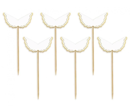 Pikery "Aniołek" — zestaw 6 papierowych dekoracji na drewnianych patyczkach: wysokość 11 cm, szerokość ok. 4 cm. Biały aniołek z złotym, błyszczącym konturem. Przeznaczone do dekoracji tortów, muffinek i słodkich stołów przy chrzcinach, komuniach, świętach i przyjęciach okolicznościowych.