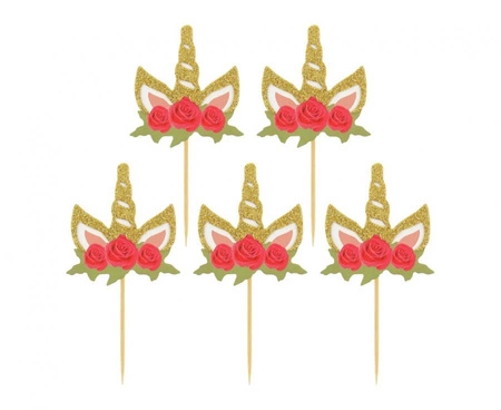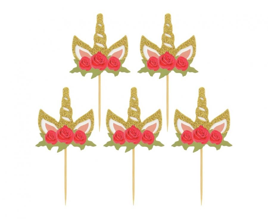 Pikery Jednorożec z kwiatami to zestaw 6 wielokolorowych topperów na patyczkach (wys. 10 cm, kształt jednorożca 4,5×4,5 cm) przeznaczonych do dekoracji babeczek, deserów i stołów imprezowych. Najlepiej sprawdzą się na urodzinach dzieci, baby shower oraz wieczorach panieńskich.