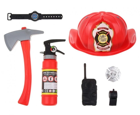 - Komplet 7 elementów: hełm, gaśnica, toporek, atrapa krótkofalówki, zegarek, gwizdek, odznaka.