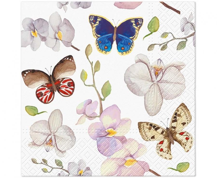 Serwetki papierowe Orchidea Butterfly 33×33 cm, 20 sztuk, z nadrukiem motyli i kwiatów. Wykonane z bibuły (papier typu tissue), wielowarstwowe. Najlepiej nadają się do nakrycia stołu i dekoracji podczas wesel, urodzin, baby shower oraz kameralnych przyjęć.