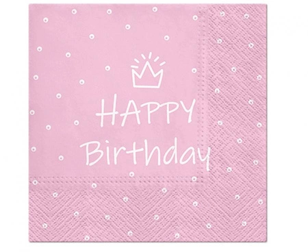 Serwetki wzorzyste Special Day (light pink) to papierowe serwetki o wymiarze 33×33 cm z nadrukiem "Happy Birthday". Opakowanie zawiera 20 sztuk. Produkt przeznaczony głównie na urodzinowe przyjęcia, roczki i imprezy tematyczne dla dziewczynek — do zastawy stołu i dekoracji stołu.