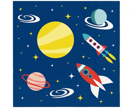Serwetki papierowe "Kosmos" 33×33 cm, 20 sztuk, z motywami gwiazd, planet i rakiet w kolorach granatowym, żółtym, czerwonym i niebieskim. Trzywarstwowy papier (16 g/m²) z tłoczonym geometrycznym wzorem — przeznaczone do nakryć stołu i dekoracji przyjęć tematycznych, np. urodzin, baby shower czy wieczoru tematycznego.