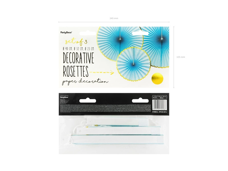 Wprowadź odrobinę elegancji i stylu na każdą imprezę dzięki rozetom dekoracyjnym Yummy w kolorze jasnoniebieskim ze złotymi brzegami. Te piękne dekoracje są idealne na różnorodne okazje, takie jak wesela, wieczory panieńskie, urodziny, baby shower, Boże Narodzenie, Walentynki i wiele innych. W zestawie znajdziesz trzy rozety o średnicach 40 cm, 32 cm i 23 cm, które z pewnością przyciągną uwagę Twoich gości.