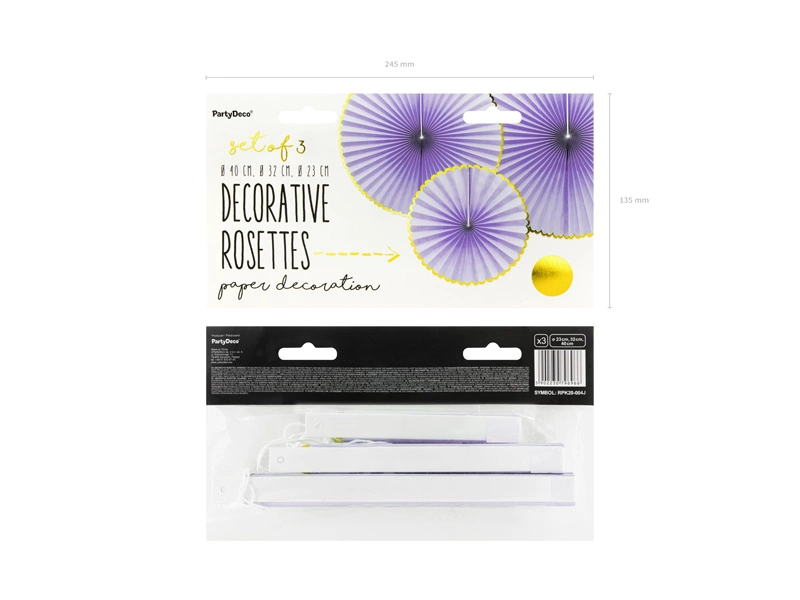 Chcesz dodać odrobinę elegancji i uroku do swojej imprezy? Rozety dekoracyjne Yummy w kolorze jasnoliliowym ze złotymi brzegami to idealne rozwiązanie! Te piękne dekoracje doskonale sprawdzą się na weselach, wieczorach panieńskich, urodzinach, Halloween, baby shower, Bożym Narodzeniu, Walentynkach i wielu innych okazjach. W zestawie znajdziesz trzy rozety o średnicach 40 cm, 32 cm i 23 cm, które z pewnością przyciągną uwagę Twoich gości.