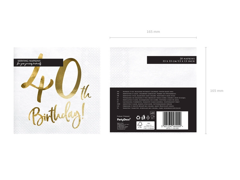 - Serwetki papierowe 40th Birthday w kolorze białym ze złotym wzorem wymiary po rozłożeniu ok. 33 x 33 cm, wymiary po złożeniu ok. 16,5 x 16,5 cm. (1 op. / 20 szt.)