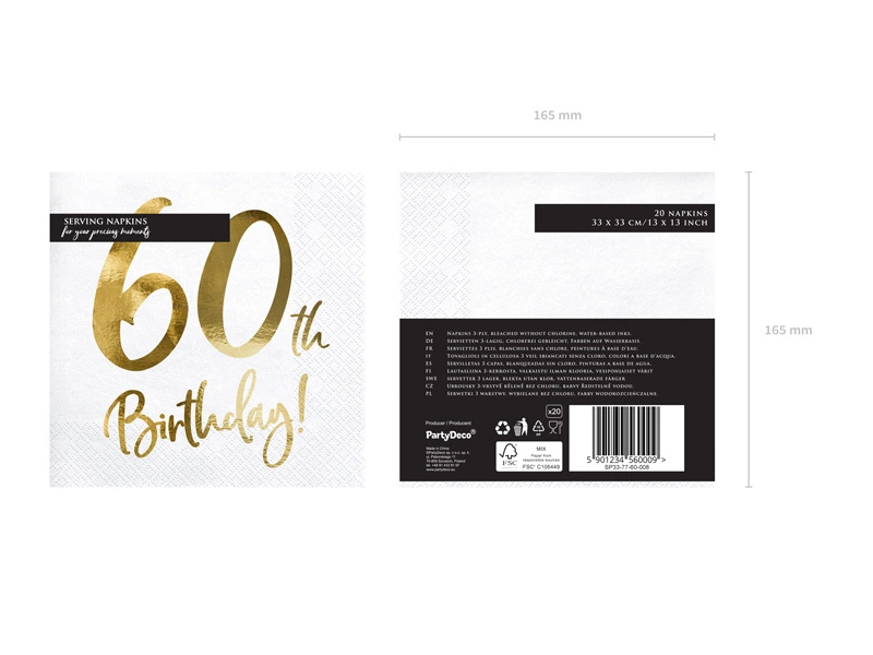 Serwetki 60th Birthday, biały, 33x33cm (1 op. / 20 szt.)