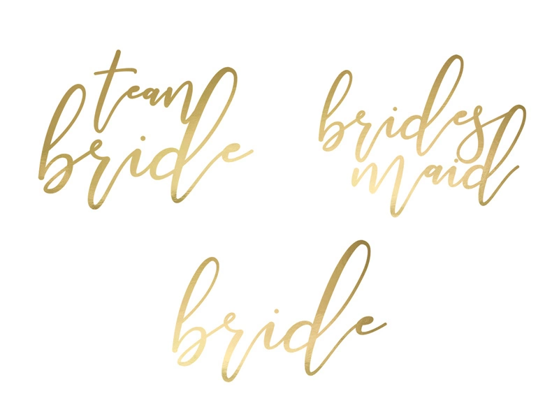 - Tatuaże zmywalne na wieczór panieński w kolorze złotym metalizowanym, zestaw zawiera napisy: bride (2 szt.), bridesmaid (2 szt.) i team bride (11 szt.). (1 op. / 15 szt.)