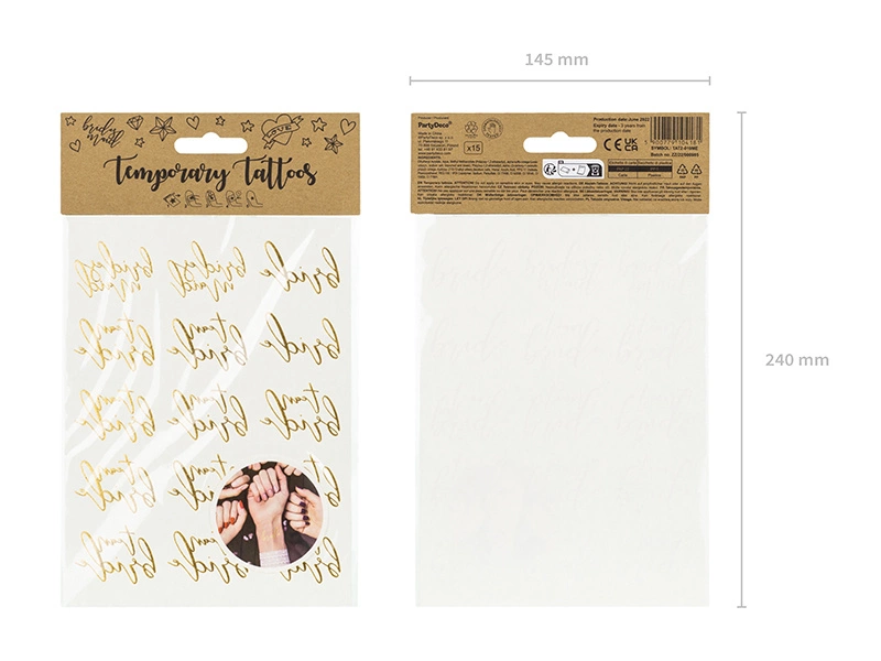 Przygotuj się na niezapomniany wieczór panieński z naszymi zmywalnymi tatuażami w kolorze złotym metalizowanym. Ten zestaw, zawierający 15 tatuaży z napisami: "bride" (2 szt.), "bridesmaid" (2 szt.) i "team bride" (11 szt.), doda blasku i elegancji każdej imprezie. Tatuaże są łatwe do nałożenia i usunięcia, co czyni je idealnym dodatkiem do Twojej zabawy.