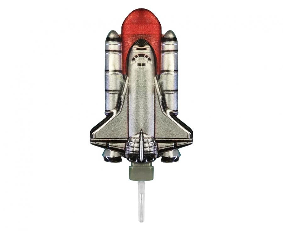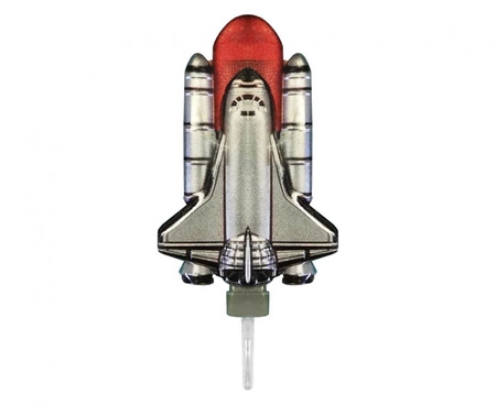 Metaliczna świeczka tortowa w kształcie rakiety, srebrna, 1 sztuka, producent Godan S.A. Przeznaczona do dekoracji tortów na urodziny, tematyczne przyjęcia (kosmos), baby shower czy wieczór panieński. Prosty montaż pozwala szybko ustawić ją na standardowym torcie przed podaniem.