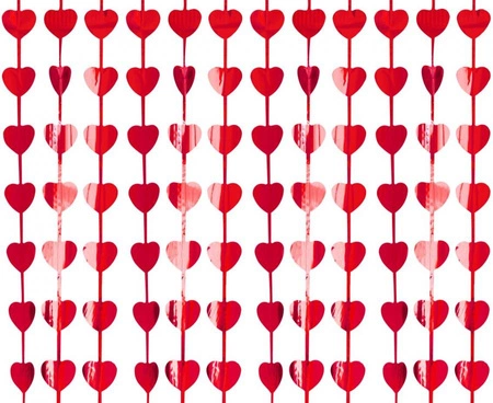 Kurtyna dekoracyjna "Kurtyna Serca" metaliczna czerwona, 100 x 200 cm, wykonana z foliowych pasków z wykrojonymi serduszkami. Jedna sztuka w opakowaniu, producent Godan S.A. Przeznaczona głównie do użytku wewnętrznego jako tło lub przegroda na wesela, wieczory panieńskie, urodziny, baby shower i Walentynki.
