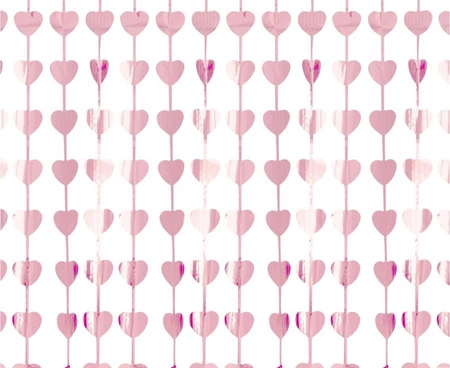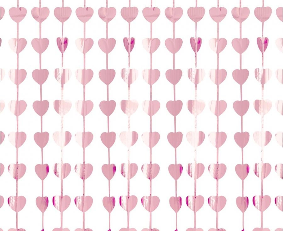 Kurtyna dekoracyjna "Serca" metaliczna różowa, wymiar 100 x 200 cm, wykonana z foliowych paseczków z wyciętymi serduszkami. Przeznaczona do zawieszenia we wnętrzach jako tło do zdjęć lub dekoracyjna przegroda na wesela, wieczory panieńskie, urodziny i baby shower.