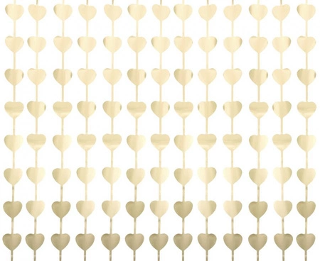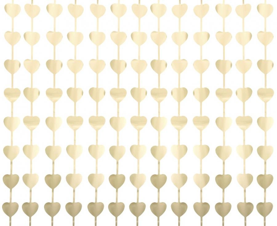 Kurtyna foliowa z wyciętymi sercami o wymiarach 100×200 cm w matowej jasnozłotej tonacji. Przeznaczona do użytku wewnętrznego — sprawdzi się jako tło do zdjęć, dekoracja ściany lub wejścia na weselu, wieczorze panieńskim, urodzinach, baby shower czy Walentynkach. Lekka i łatwa w montażu.