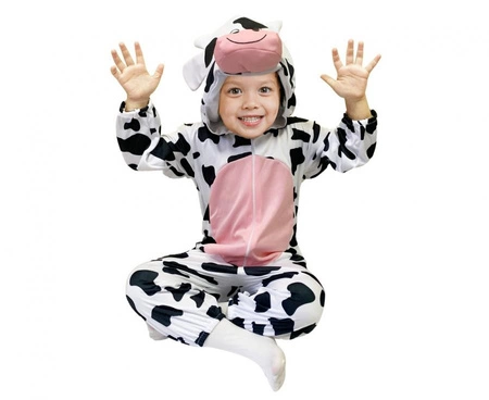 Strój dziecięcy "Mała Krówka" to jednoczęściowy kombinezon z kapturem w rozmiarze 92/104 cm, przeznaczony dla dzieci ok. 2–4 lat. Kolor biało-czarny z różowymi akcentami. Materiał: 100% poliester. W zestawie znajduje się sam kombinezon z kapturem; sprawdzi się na bale przebierańców, Halloween i zabawy tematyczne.