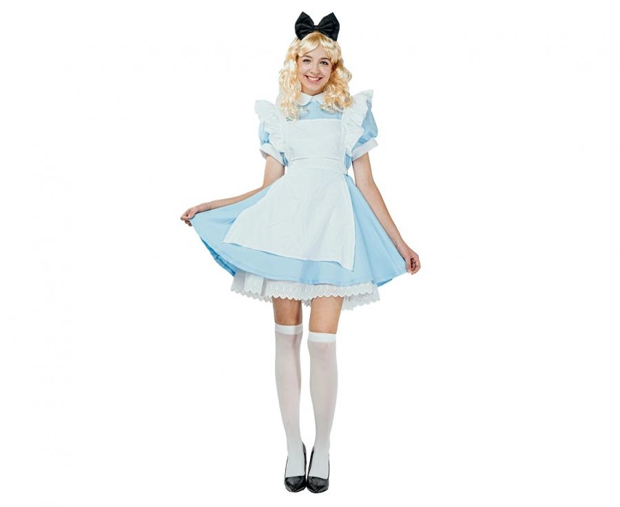 - Kolor biało‑niebieski typowy dla kostiumu „Alicja” — łatwy do dopasowania z dodatkami.