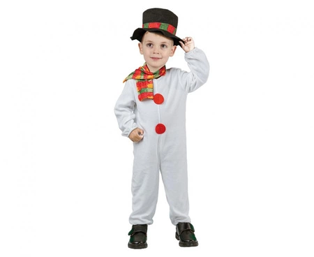 Zestaw stroju bałwanka dla dzieci, rozmiar 92/104, zawiera biały kombinezon, kolorowy szalik i czarny kapelusz. Wykonany w 100% z poliestru, producent Godan. Nadaje się na świąteczne przyjęcia, jasełka, przedszkolne występy i sesje zdjęciowe, gdzie potrzebne jest rozpoznawalne przebranie.