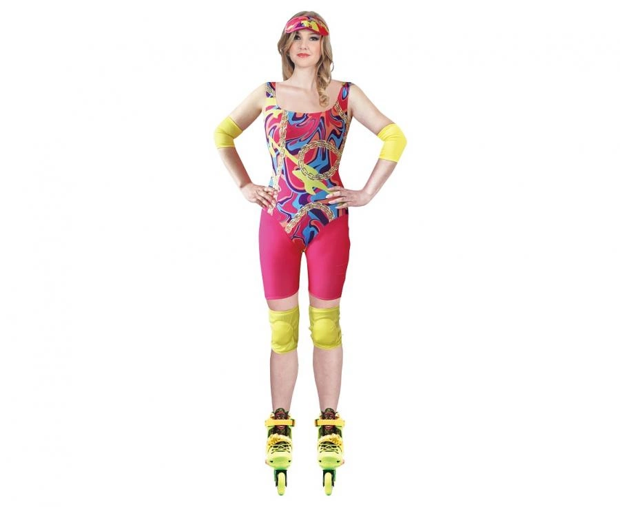 Zestaw Rolkarka Lata 80' to kompletny strój w rozmiarze S: czapka, kostium, opaski na nadgarstki i ochraniacze na kolana. Wykonany w 100% z poliestru, w kolorach różowym, żółtym i niebieskim. Przeznaczony na imprezy tematyczne, przebrania, wieczory panieńskie, Halloween i karnawał.