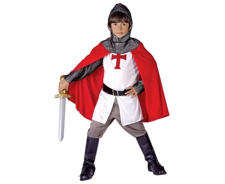 Zestaw dla dzieci Rycerz Krzyżak (bluzka z paskiem, spodnie, peleryna, nakładki na buty, kaptur), rozm.120/130 cm