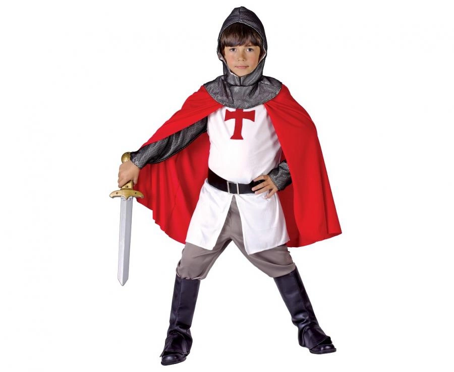 Zestaw przebrania "Rycerz Krzyżak" w rozmiarze 130/140 cm zawiera bluzkę z paskiem, spodnie, pelerynę, nakładki na buty i kaptur. Wykonany w 100% z poliestru, przeznaczony na karnawał, przedstawienia szkolne, zabawy tematyczne oraz Halloween — kompletny zestaw gotowy do szybkiego użycia.