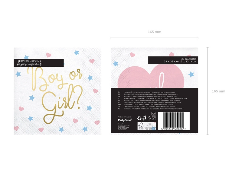 - Serwetki papierowe, mix kolorów ze złotym metalizowanym napisem Boy or Girl, wymiary po rozłożeniu ok. 33 x 33 cm, wymiary po złożeniu ok. 16,5 x 16,5 cm. (1 op. / 20 szt.)