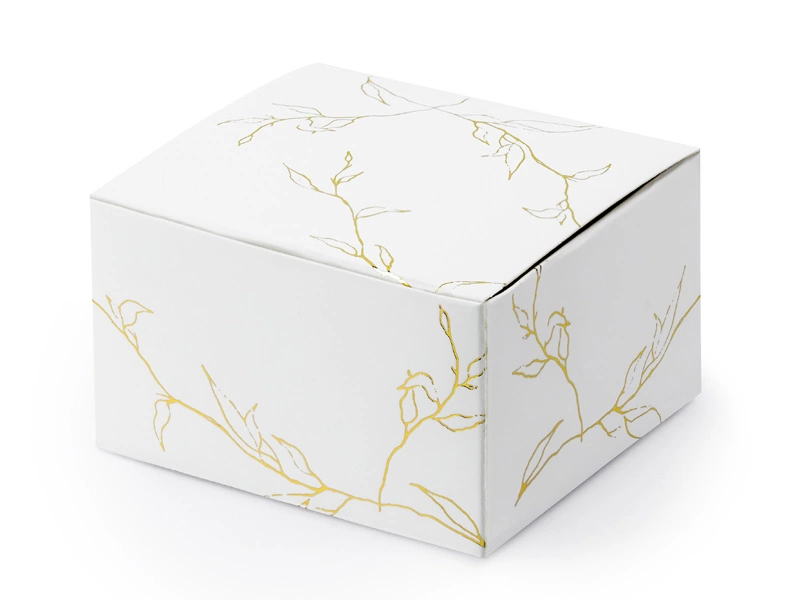 - Pudełeczka w kolorze białym ze złotymi gałązkami, wymiary po złożeniu ok. 6 x 3,5 x 5,5 cm. (1 op. / 10 szt.)