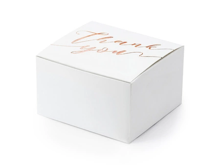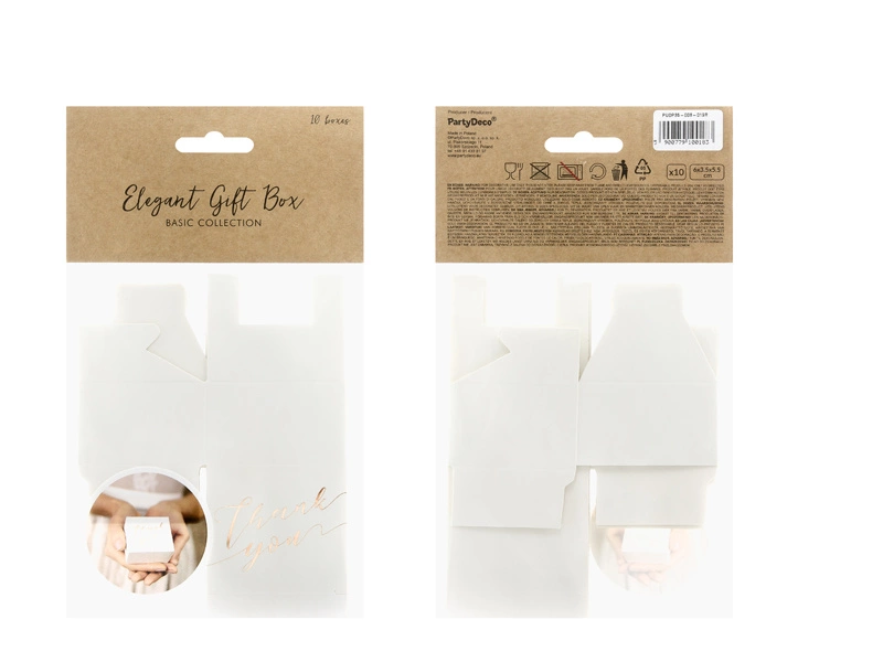 - Pudełeczka w kolorze białym z metalizowanym napisem Thank you w kolorze różowego złota, wymiary po złożeniu ok. 6 x 3,5 x 5,5 cm. (1 op. / 10 szt.)