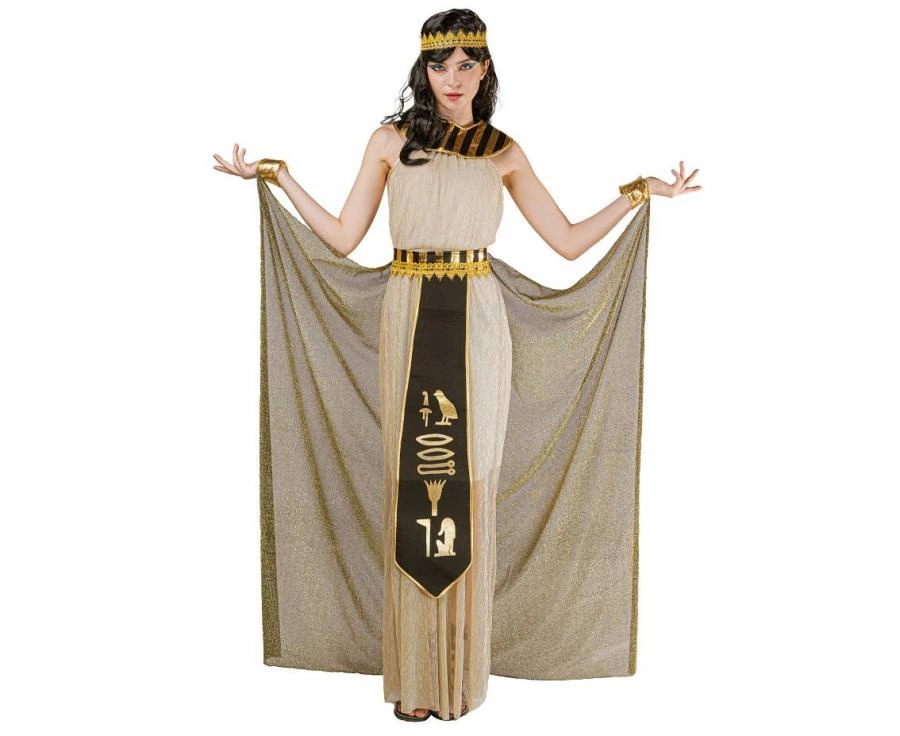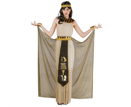 Kostium „Egipcjanka” to komplet dla dorosłych w rozmiarze M: opaska, kołnierz, sukienka, peleryna z nakładkami na nadgarstki oraz pasek. Kolory: złoty i brązowy. Materiał: 100% poliester. Przeznaczony na imprezy tematyczne, karnawał, wieczory panieńskie i sesje zdjęciowe.