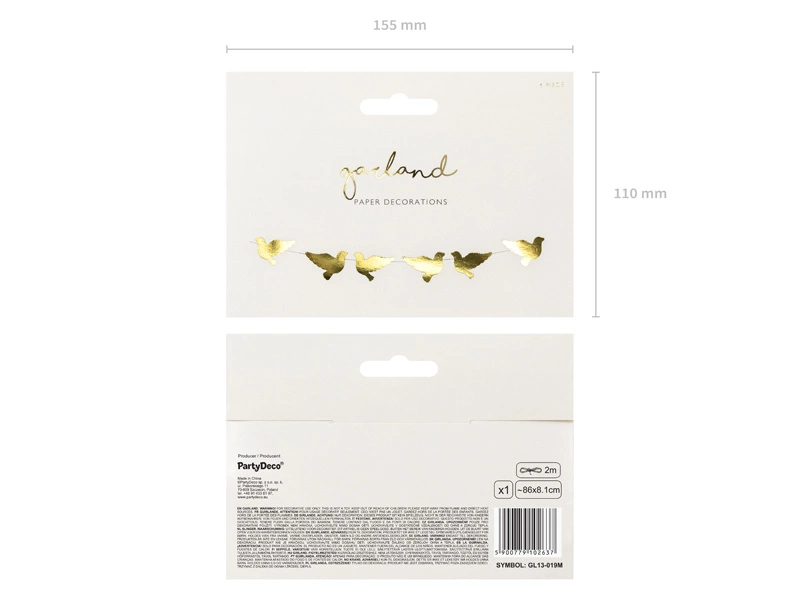 Chcesz dodać odrobinę elegancji i blasku do swojej imprezy? Nasza przeszywana girlanda Gołębie w kolorze złotym lustrzanym jest idealnym wyborem! Doskonale sprawdzi się na weselach, wieczorach panieńskich, urodzinach, baby shower, Bożym Narodzeniu, Walentynkach i wielu innych okazjach. Girlanda o długości 112 cm i wysokości 8,1 cm z pewnością przyciągnie uwagę i doda wyjątkowego uroku Twojemu wydarzeniu.