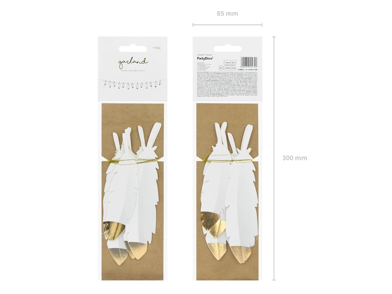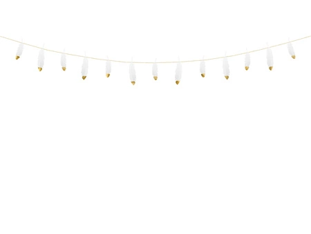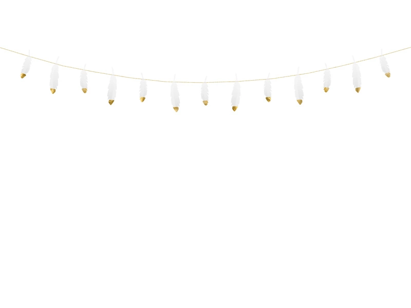 - Girlanda przeszywana Piórka w kolorze białym ze złotymi metalizowanymi końcówkami, wymiary: wysokość ok. 13,5 cm, długość ok. 1,6 m.
