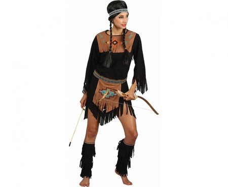 Zestaw „Waleczna Indianka” to kompletny strój damski w rozmiarze S, zawierający opaskę, sukienkę, pasek oraz naramienniki (w niektórych ofertach określane jako ochraniacze na nogi). Kolory: brązowy i czarny. Materiał: 100% poliester. Przeznaczony na imprezy tematyczne, wieczory panieńskie, urodziny i Halloween.
