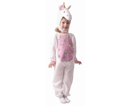Kostium jednorożca dla dziecka w rozmiarze 92/104 cm. Zestaw zawiera kombinezon i kaptur z rogiem jednorożca. Biały strój wykonano z 100% poliestru; jest lekki i wygodny. Prosty krój pozwala na swobodę ruchu — sprawdzi się na balach przebierańców, urodzinach i sesjach zdjęciowych.