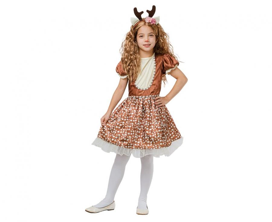 Zestaw dla dzieci „Jelonek” — sukienka i opaska w rozmiarze 110/120 cm, kolor brązowo‑biały, materiał: 100% poliester, producent: Godan. Przeznaczony dla dziewczynek jako przebranie na bale kostiumowe, wieczory tematyczne, Halloween, sesje zdjęciowe i zabawy przedszkolne. Lekka konstrukcja ułatwia zakładanie, a poliester jest odporny na zagniecenia i łatwy w czyszczeniu.