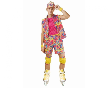 Zestaw dla dorosłych "Rolkarz Lata 80'" to komplet kostiumowy zawierający czapkę, kostium, opaski na nadgarstki i ochraniacze na kolana. Rozmiar 52, materiał 100% poliester, kolor wielobarwny. Przeznaczony na imprezy tematyczne, wieczory panieńskie i Halloween; umożliwia szybkie przebranie i spójny wygląd uczestnika.