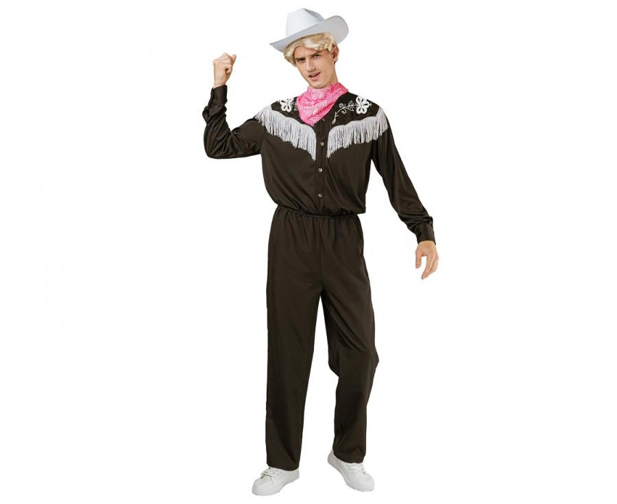 Strój kowboj dla dorosłych — komplet zawiera kapelusz, szalik i bluzkę (rozmiar 52; dostępne również rozmiary 56 oraz wariant różowy z dodatkowymi spodniami w rozmiarze M). Kolory: czarny, biały, różowy. Materiał: 100% poliester. Przeznaczony na imprezy tematyczne, karnawał, wieczór panieński i przebrania.