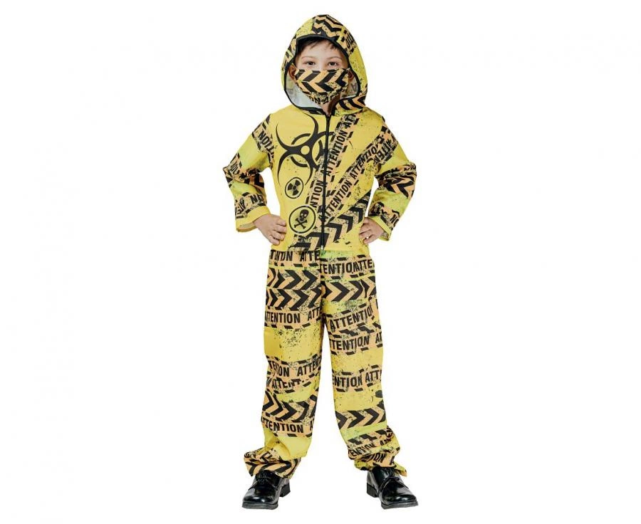 Zestaw dla dzieci: kombinezon ochronny składający się z bluzki, spodni i maski, rozmiar 130/140 cm. Wykonany w 100% z poliestru, przeznaczony na przebrania na Halloween, zabawy tematyczne, sesje zdjęciowe i imprezy kostiumowe. Prosty w zakładaniu i utrzymaniu czystości.