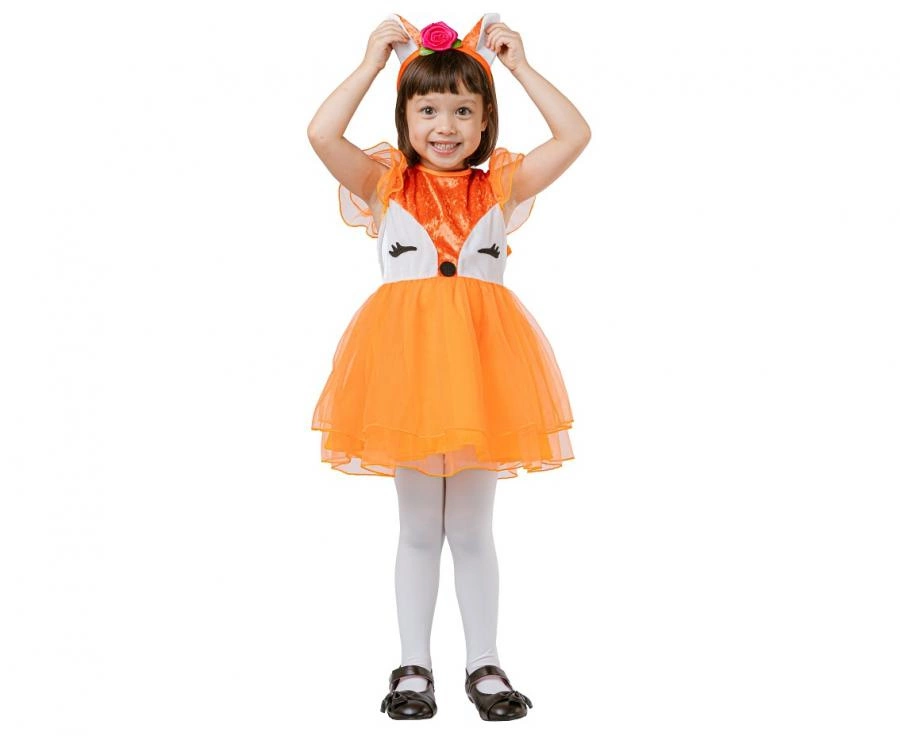 Zestaw dziecięcy "Lisiczka" zawiera sukienkę i opaskę w rozmiarze 92/104 cm. Sukienka ma długość 52 cm, szerokość pod pachami 25 cm, w ramionach 20 cm i w pasie 22 cm. Kolor: pomarańczowy, materiał: 100% poliester. Przeznaczony na przebrania, urodziny, Halloween i zabawy tematyczne.