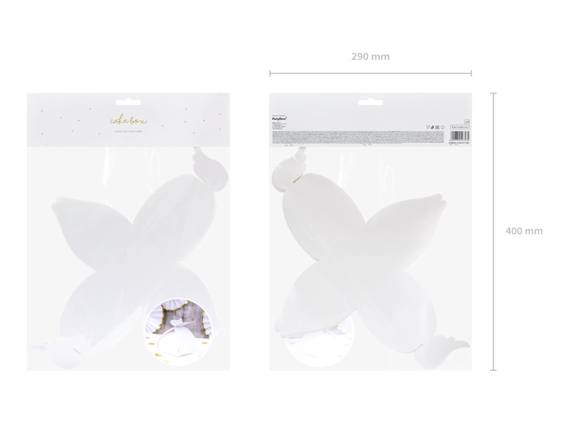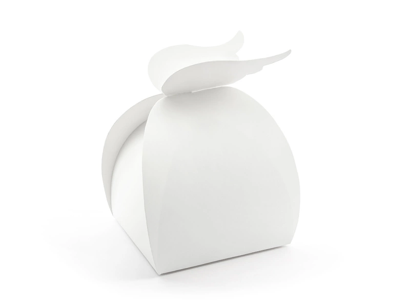 - Pudełka wykonane z białego papieru w kształcie skrzydeł, szerokość ok. 8,5 cm, wysokość ok. 14,5 cm, głębokość ok. 8,5 cm. (1 op. / 10 szt.)